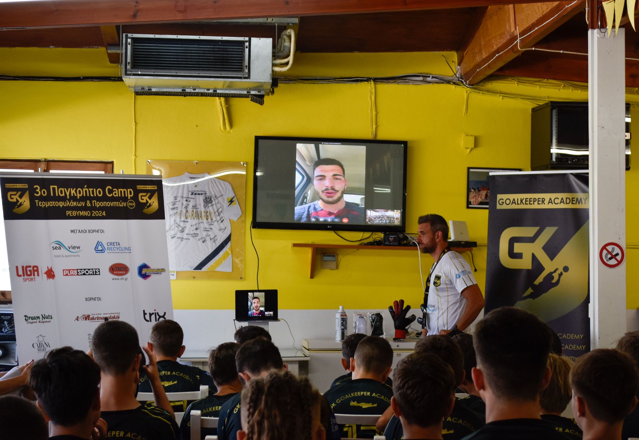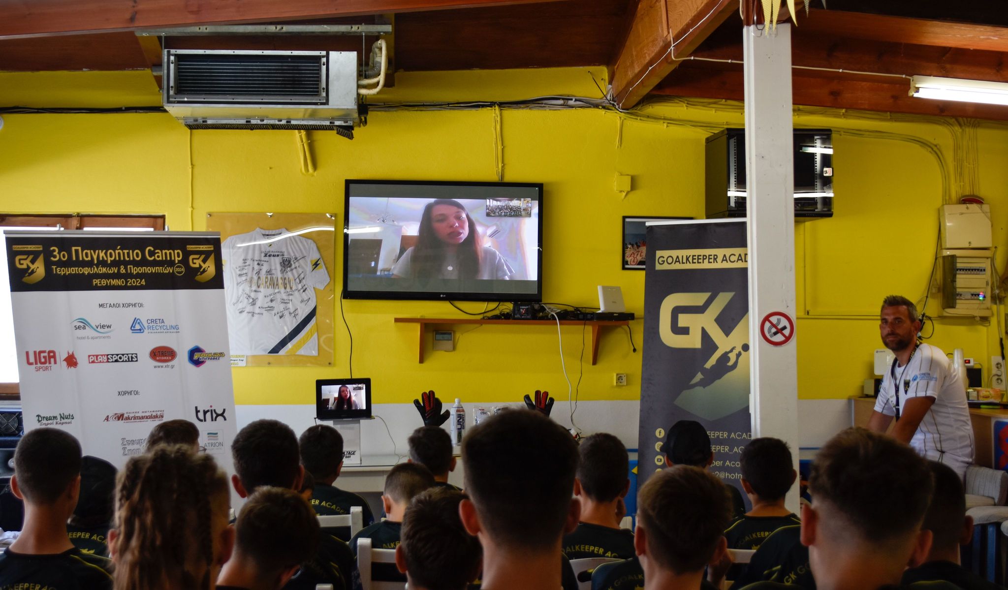 Το πρόγραμμα της Κυριακής άνοιξε με τον τερματοφύλακα της Οσασούνα, Δημήτρη Σταματάκη, να εμφανίζεται στην αίθουσα διαδικτυακά. Ο Κρητικός goalkeeper, ο οποίος έχει αναδειχθεί μέσα από το εκπαιδευτικό πρόγραμμα του Πανελλήνιου Δικτύου Τερματοφυλάκων, μίλησε στους νεαρούς αθλητές για τη δική του διαδρομή, την εξειδικευμένη εκπαίδευση που έλαβε, την αξιολόγηση σε συλλόγους του εξωτερικού και τη μεταγραφή του στην Ατλέτικο Μαδρίτης πριν από τρία χρόνια.