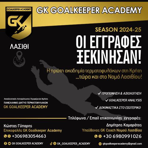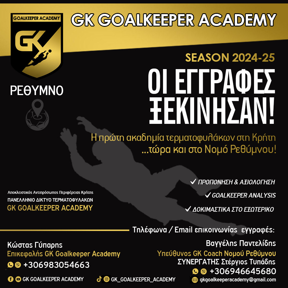 Η ποδοσφαιρική σεζόν 2024-25 άρχισε και η GK Goalkeeper Academy επιστρέφει πιο δυναμικά από ποτέ στο καθημερινό πρόγραμμα προπονήσεων. Στόχος της Ακαδημίας είναι να προσφέρει για μία ακόμη χρονιά κορυφαίου επιπέδου εκπαίδευση σε όλους τους νεαρούς, αλλά και επαγγελματίες τερματοφύλακες της Κρήτης.