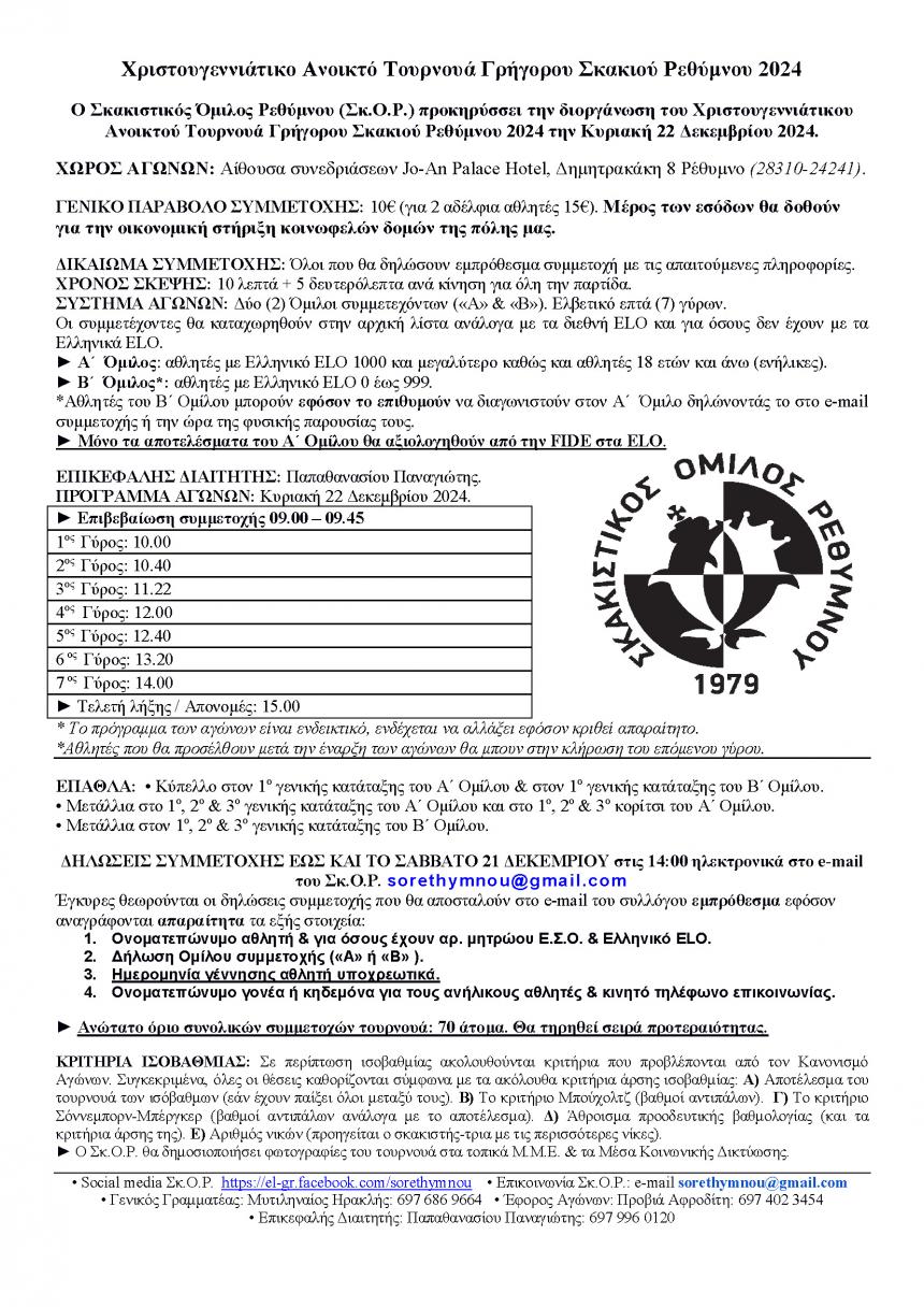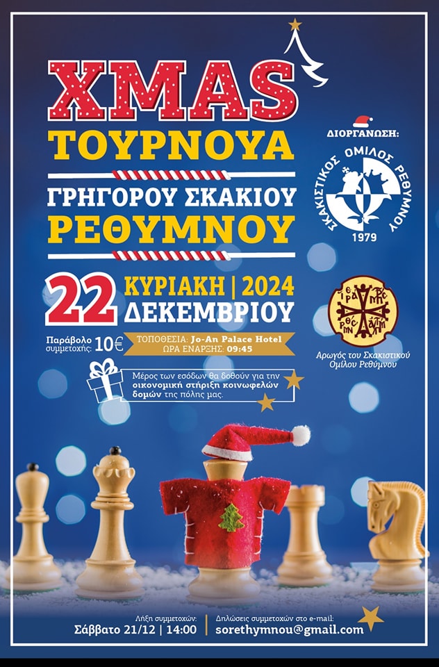 ΑΘΛΗΤΙΚΑ 18.12.2024 11:49Χριστουγεννιάτικο Ανοικτό Τουρνουά Γρήγορου Σκακιού Ρεθύμνου 2024 Ρέθεμνος Newsroom Facebook Twitter Copy link 0 0 Facebook Twitter Copy link ΣΧΕΤΙΚΑ ΑΡΘΡΑ Αθλητικά 04.02.2026 09:26Μιχάλης Ζαμπίδης vs Φλόιντ Μεϊγουέδερ: Η μεγάλη επιστροφή του Iron Mike στα ρινγκ Αθλητικά 30.01.2026 10:44Επίσκεψη του Ρέθυμνο Cretan Kings στο 5ο Δημοτικό Σχολείο Ρεθύμνου Αθλητικά 29.01.2026 12:30Στο 4ο Νηπιαγωγείο το Ρέθυμνο Cretan Kings Αθλητικά 26.01.2026 11:27“Το Ρέθυμνο Cretan Kings διοργανώνει Εθελοντική Αιμοδοσία”
