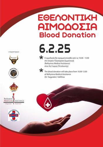 «Το Ρέθυμνο Cretan Kings, ενημερώνει τους φίλους του, ότι την Πέμπτη 6 Φεβρουαρίου, στο πλαίσιο του Κοινωνικού προγράμματος, Cretan Kings Assist διοργανώνει Εθελοντική Αιμοδοσία, σε συνεργασία με τα ιατρεία Rethymno Medical Assistance και το Γενικό Νοσοκομείο Ρέθυμνου.