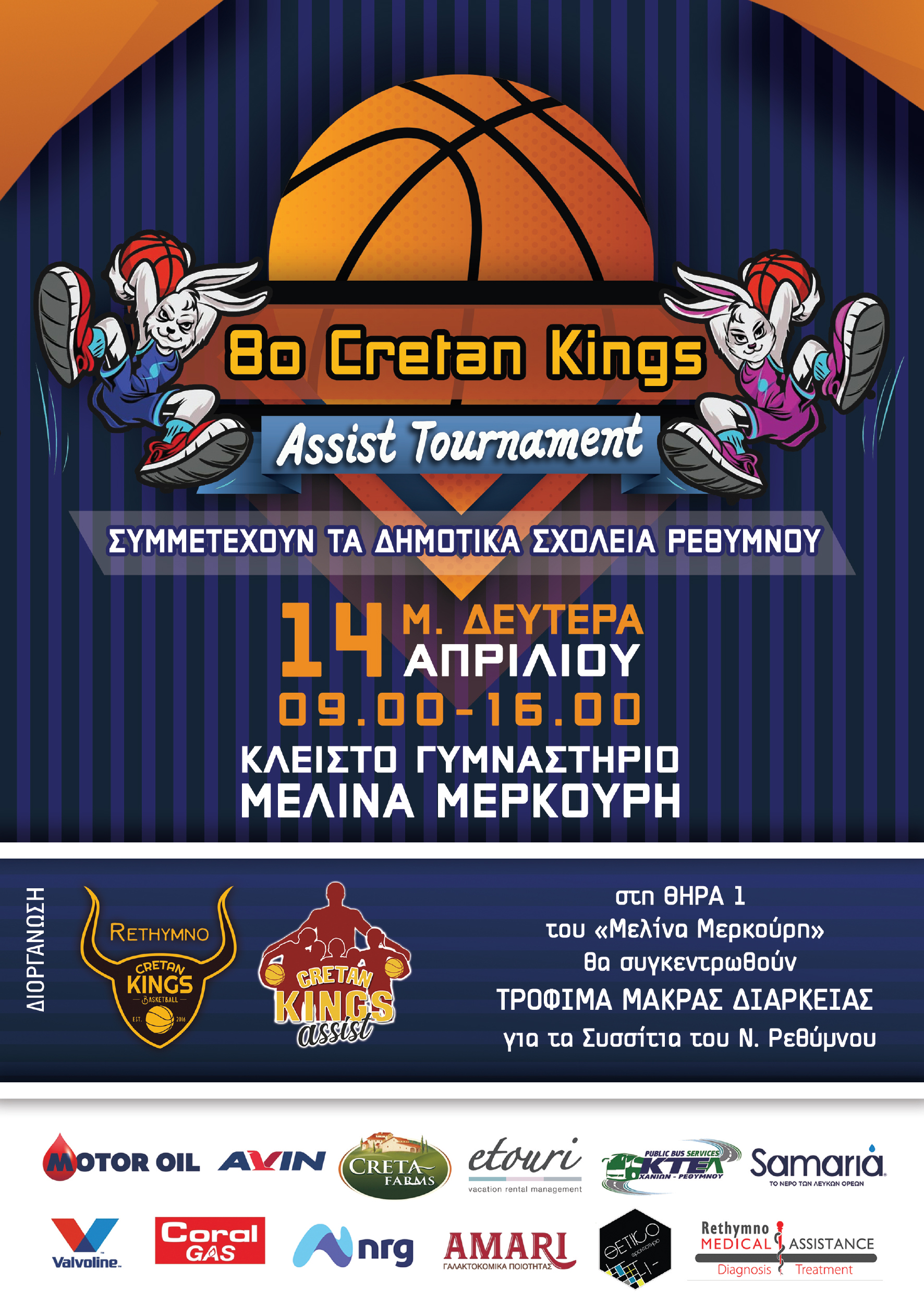 Ένα βήμα πριν την έναρξη του «8ου Cretan Kings Assist Tournament», το οποίο θα φιλοξενηθεί την Μ. Δευτέρα 14 Απριλίου, στο κλ. Γυμναστήριο «Μ. Μερκούρη» και διοργανώνει η ομάδα του Ρέθυμνο Cretan Kings.