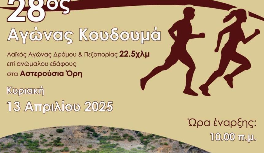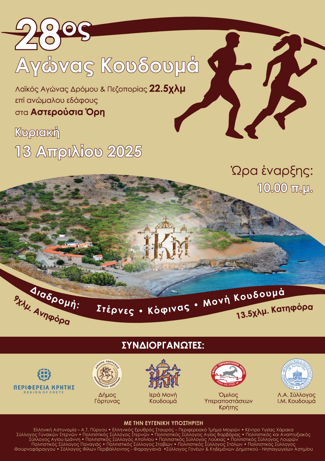 Ο Δήμος Γόρτυνας, η Περιφέρεια Κρήτης, η Ιερά Μονή Κουδουμά, ο Όμιλος Υπεραποστάσεων Κρήτης και ο Λαογραφικός Αρχαιολογικός Σύλλογος Ιεράς Μονής Κουδουμά, συνδιοργανώνουν την Κυριακή των Βαΐων 13 Απριλίου 2025, τον 28ο Αγώνα Ανώμαλου Δρόμου και Πεζοπορίας Κουδουμά (εκκίνηση: Στέρνες – τερματισμός: Ιερά Μονή Κουδουμά).