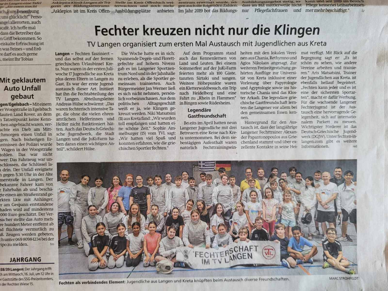 Η Γερμανική 13 μελής αποστολή βρέθηκε στο Ρέθυμνο από 10 έως 17 Απριλίου, όπου προπονήθηκε στο 2ο Crete Fencing Camp(12-13 Απριλίου) με ξιφομάχους από όλη την Κρήτη , εκεί μάλιστα ο Πρόεδρος και ο προπονητής του Γερμανικού συλλόγου είχαν τη χαρά να γνωρίσουν, να συνομιλήσουν και να ανταλλάξουν αθλητικές απόψεις με τον Αντιδήμαρχο αθλητισμού Κο Προβιά, ο οποίος στήριξε το όλο εγχείρημα από την αρχή. Επίσης η Γερμανική αποστολή επισκέφτηκε την ιστορική μονή Αρκαδίου, το Πανεπιστήμιο Κρήτης όπου είδε ανεκτίμητους αρχαιολογικούς θησαυρούς, την παλιά πόλη των Χανίων και φυσικά απόλαυσε την Κρητική φιλοξενία την οποία και χαρακτήρισε ¨Θρυλική¨ στην τοπική εφημερίδα του Langen.