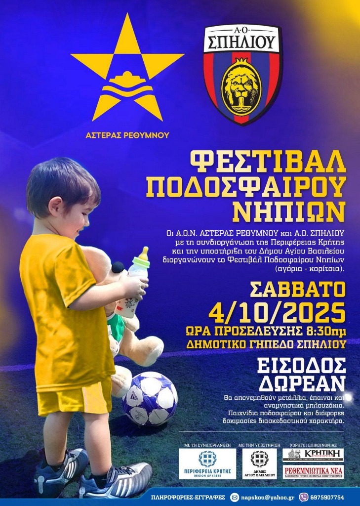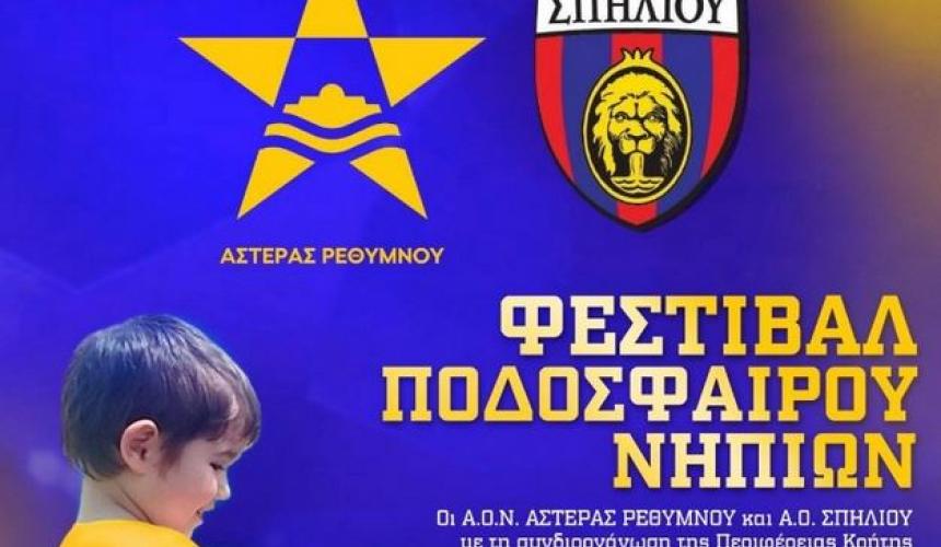 Ο ΑΟΝ Αστέρας Ρεθύμνου και ο ΑΟ Σπηλίου με την συνδιοργάνωση της Πειφέρειας Κρήτης και την υποστήριξη του Δήμου Αγίου Βασιλείου διοργανώνουν το Φεστιβάλ Ποδοσφαίρου Νηπίων (αγόρια-κορίτσια).