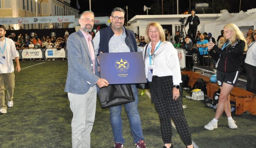 Πιο συγκεκριμένα η Γενική Γραμματέας του ΔΣ του Αστέρα Ρεθύμνου κα Κατερίνα Ντορμπάρη-Δεσποτοπούλου παρέδωσε αναμνηστικό καμβά με το επετειακό λογότυπο του συλλόγου, στους εκπροσώπους της Οργανωτικής Επιτροπής του TUI Socca Champions League κ.κ. Θάνο Παπαδόπουλο και Στράτο Σιπετζή. Επιπλέον ο Ταμίας του ΔΣ του Αστέρα Ρεθύμνου κ. Κώστας Μανουσάκης παρέδωσε αντίστοιχο καμβά στον Δήμο Ρεθύμνου, τον οποίο παρέλαβε Αντιδήμαρχος Αθλητισμού κ. Νικόλαος Προβιάς.