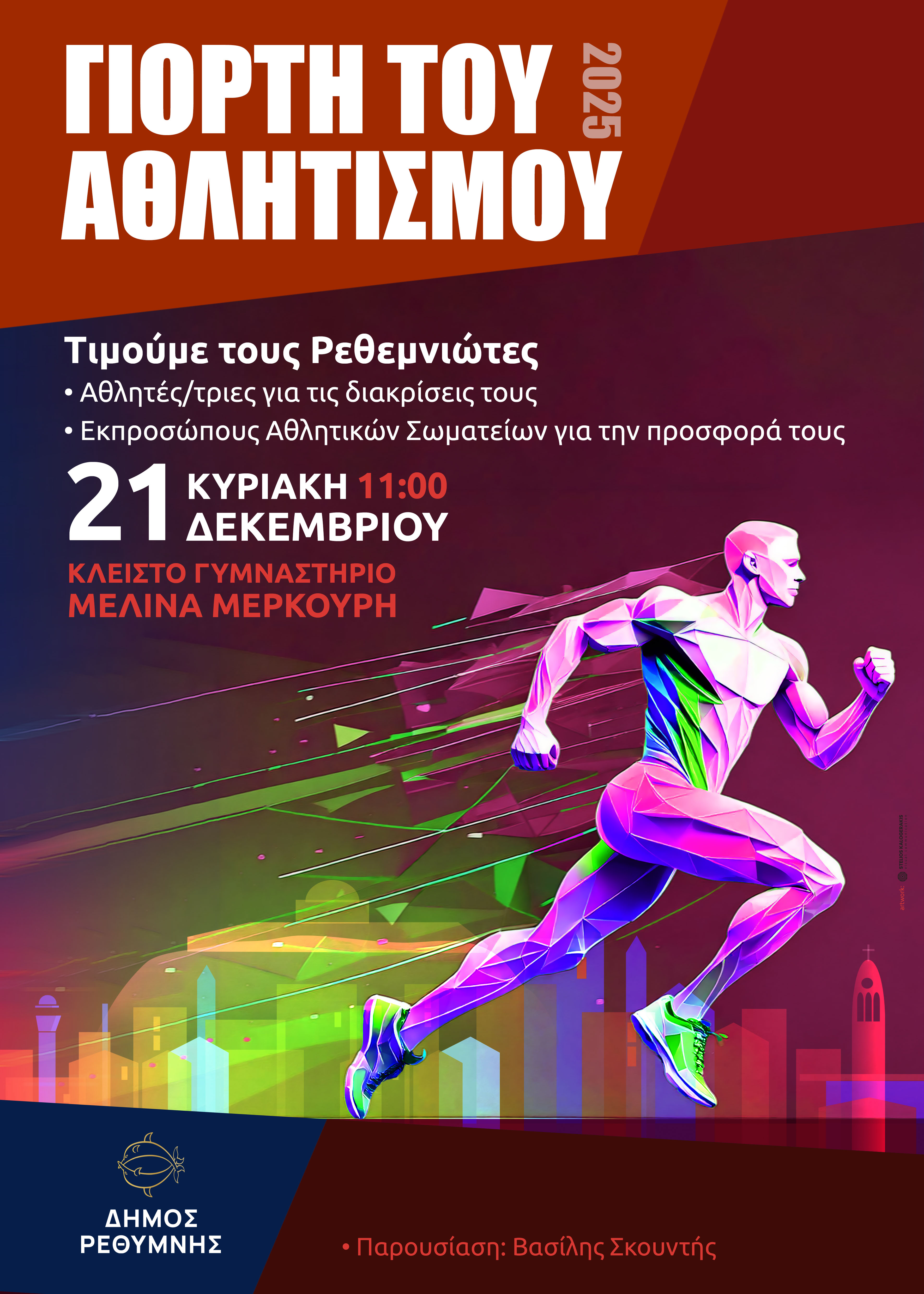 Σε αυτό το καθιερωμένο αντάμωμα θα βραβευθούν, ως είθισται, αθλητές, αθλήτριες, προπονητές, παράγοντες και σύλλογοι του Δήμου Ρεθύμνης που διακρίθηκαν σε όλη τη γκάμα των εγχώριων και διεθνών διοργανώσεων το 2025.