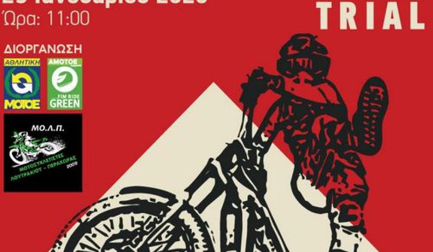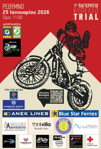 Η ΜΟ.Λ.Π. – Μοτοσικλετιστές Λουτρακίου Περαχώρας και Α,ΜΟΤ.Ο.Ε. Αθλητική Μοτοσυκλετιστική Ομοσπονδία Ελλάδος διοργανώνουν τον 1ο αγώνα του Παγκρήτιου Κυπέλλου Trial, την Κυριακή 25 Ιανουαρίου στις 11:00, στην περιοχή Πευκάκια – Ευλιγιά στο Ρέθυμνο.