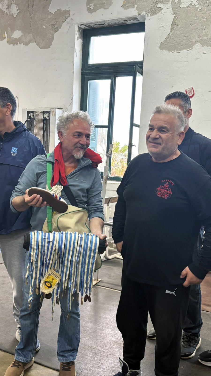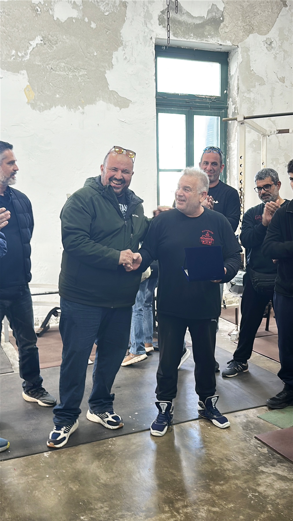 Η πρωτοβουλία, που ξεκίνησε ως ιδέα από τον γιο του προπονητή, διαδόθηκε αστραπιαία «από στόμα σε στόμα». Το αποτέλεσμα; Περίπου 50 παλαίμαχοι παλαιστές του ΟΚΑ ΑΡΚΑΔΙ συγκεντρώθηκαν μυστικά σε αίθουσα δίπλα από εκείνη όπου διεξαγόταν η προπόνηση.