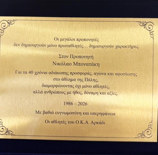 Μια βραδιά γεμάτη αναμνήσεις, συγκίνηση και αναγνώριση έζησε ο προπονητής πάλης του ΟΚΑ ΑΡΚΑΔΙ, Νίκος Μπονατάκης, την Δευτέρα 30/3 όταν βρέθηκε προ εκπλήξεως για τα 40 χρόνια της αδιάλειπτης προσφοράς του στο άθλημα και τον σύλλογο.