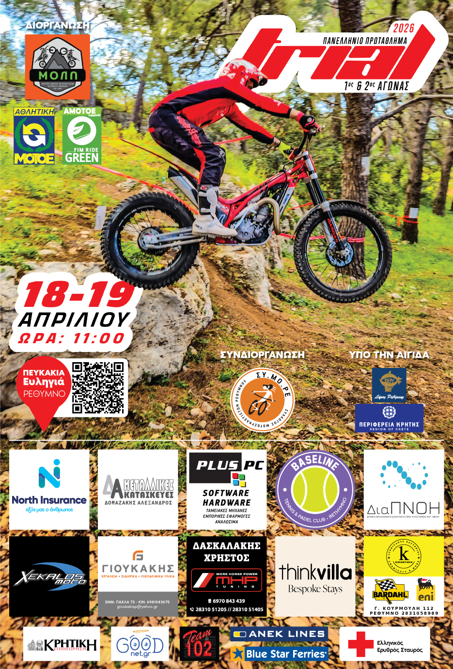 Με ιδιαίτερη χαρά ανακοινώνεται η διεξαγωγή του 1ου και 2ου αγώνα του Πανελληνίου Πρωταθλήματος Trial στο Ρέθυμνο Κρήτης, σηματοδοτώντας την επιστροφή του θεσμού στην περιοχή μετά από περισσότερα από 18 χρόνια.