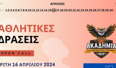 Ρέθυμνο: Αθλητικές και εικαστικές δράσεις από το σύλλογο γονέων ατόμων με αυτισμό Ο Σύλλογος Γονέων Ατόμων με Αυτισμό Ρεθύμνου και η Ακαδημία Καλαθοσφαίρισης Ρεθύμνου προσκαλούν το κοινό στην Πλατεία Αγνώστου Στρατιώτη, την Τρίτη... 13.04.2024 10:41