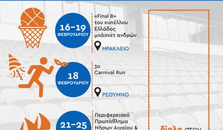 Αθλητικές διοργανώσεις με την στήριξη της Περιφέρειας Κρήτης Σημαντικές διοργανώσεις πραγματοποιούνται τις προσεχείς ημέρες στην Κρήτη, με την στήριξη της Περιφέρειας Κρήτης. Από σήμερα 16 Φεβρουαρίου έως και... 20.02.2023 14:09