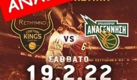 Αναβλήθηκε η αυριανή αναμέτρηση του Ρεθύμνο Cretan Kings Η αυριανή αναμέτρηση του Ρεθύμνο Cretan Kings με την Αναγέννηση Αρκαλοχωρίου για την 14η αγωνιστική του πρωταθλήματος της ΕΚΑΣΚ αναβάλλεται λόγω των... 18.02.2022 22:25