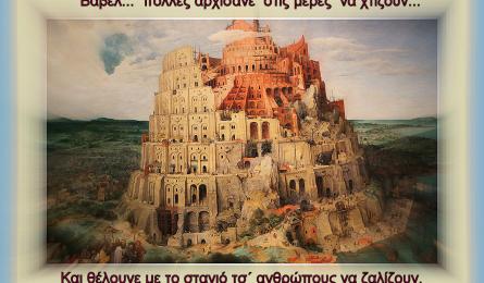 Βαβέλ, τότε... και τώρα! Εκτίζανε κι εχτίζανε ,πέρα από το σκοπό τους και θέλανε να στήσουνε ψηλά τον εαυτό τους, να τον κοιτάζουν στην κορφή και να τον... 05.09.2023 10:00