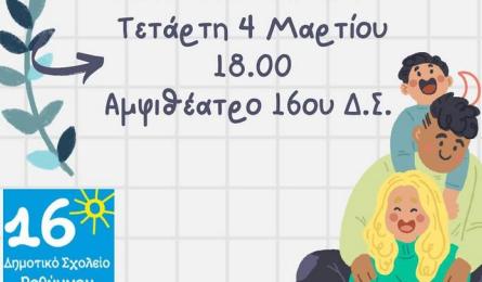 «Ανακαλύπτοντας πιο αποτελεσματικούς τρόπους επικοινωνίας με το παιδί μου» – Εκδήλωση στο 16ο Δημοτικό Ρεθύμνου Ο Σύλλογος Γονέων και Κηδεμόνων του 16ου Δημοτικού Σχολείου Ρεθύμνου διοργανώνει μία συνάντηση με την ψυχολόγο - ψυχοθεραπεύτρια - Attached at the... 27.02.2026 14:20