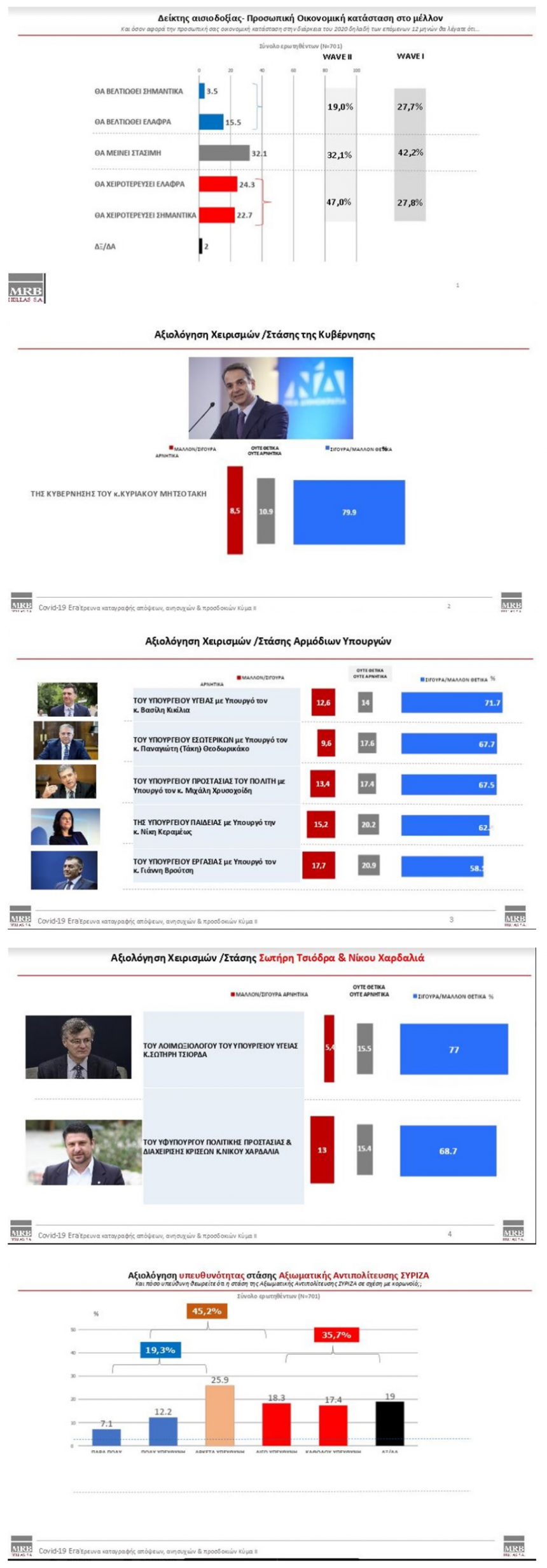 Πρώτος στην αξιολόγηση των υπουργών ο Βασίλης Κικίλιας με 71,7%, ακολουθεί ο Τάκης Θεοδωρικάκος με 67,7% και στην τρίτη θέση ο Μιχάλης Χρυσοχοΐδης με 67,5% - Υψηλά ποσοστά αποδοχής και για τα δύο κεντρικά πρόσωπα της κρίσης - Στο 77% για τον Σωτήρη Τσιόδρα και στο 69% για τον Νίκο Χαρδαλιά - Το 47% των πολιτών θεωρεί ότι θα επιδεινωθεί η οικονομική του κατάσταση στο άμεσο μέλλον λόγω της πανδημίας