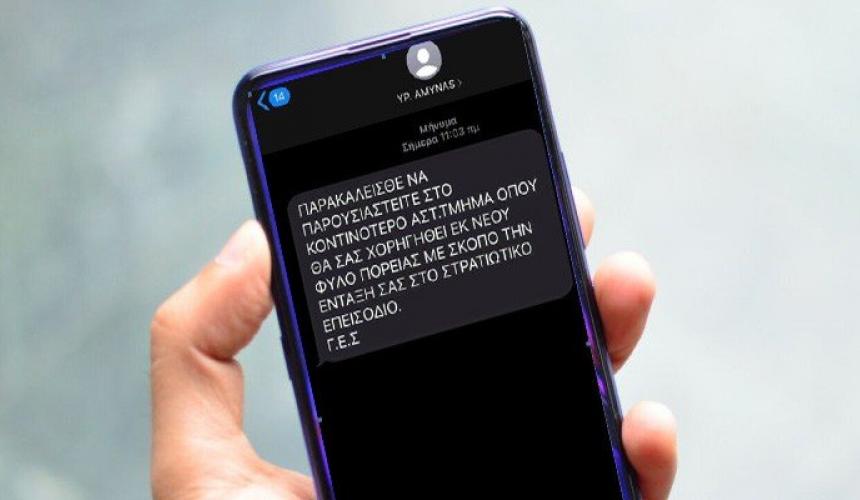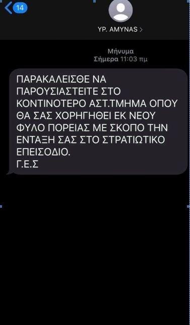 Το μήνυμα όπως βλέπετε και στη φωτογραφία, φαίνεται ότι έχει σταλεί υποτίθεται από το Υπουργείο Άμυνας και καλεί τους πολίτες να παρουσιαστούν στο κοντινότερο Αστυνομικό Τμήμα για δήθεν χορήγηση Φύλλου Πορείας από το Στρατό.