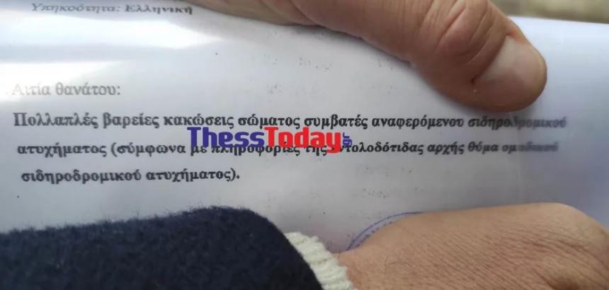 «Πολλαπλές βαρείες κακώσεις σώματος συμβατές αναφερόμενου ατυχήματος (σύμφωνα με πληροφορίες της εντολοδότιδας αρχής θύμα ομαδικού σιδηροδρομικού ατυχήματος)».