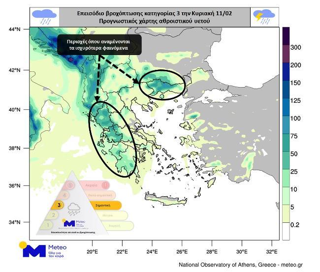 Τη Δευτέρα 12/2 τα ισχυρά φαινόμενα που αρχικά θα επηρεάζουν αρκετές περιοχές, προοδευτικά θα εντοπίζονται κυρίως στη βορειοανατολική χώρα (με μεγάλα ύψη βροχής), στα νησιά του Ανατολικού Αιγαίου και σε τμήματα των Κυκλάδων και από το βράδυ στα Δωδεκάνησα.