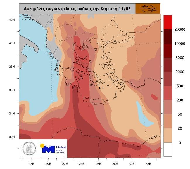 Στον παρακάτω προγνωστικό χάρτη παρουσιάζεται το αθροιστικό ύψος βροχής που αναμένεται κατά τη διάρκεια της Κυριακής 11/02.