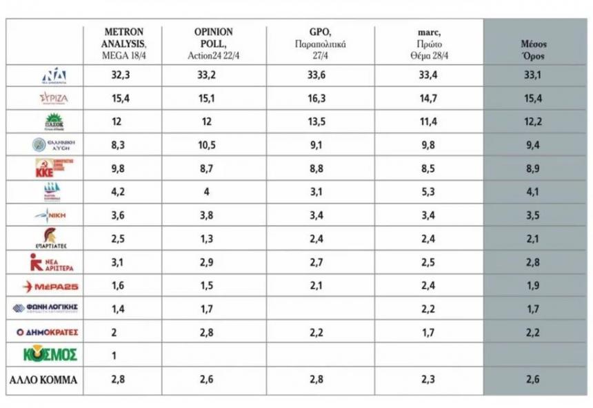 Σύμφωνα με τα ευρήματα των ερευνών η ΝΔ παραμένει κυρίαρχη του πολιτικού σκηνικού με τάσεις σταθεροποίησης και μέσο όρο 33,1%. Με άλλα λόγια πολύ κοντά στον πήχη που έθεσε ο Κυριάκος Μητσοτάκης, να εξασφαλίσει το κυβερνών κόμμα ποσοστό των προηγούμενων ευρωεκλογών.