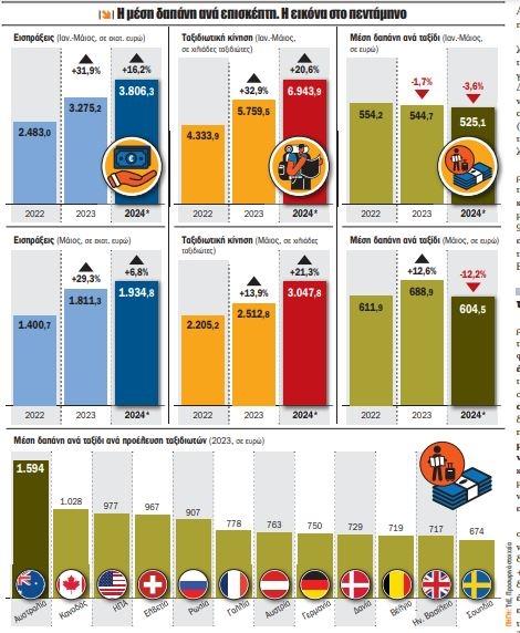 Αντίστοιχα τον Μάιο, που θεωρείται ένας πολύς καλός μήνας για την τουριστική κίνηση στην Ελλάδα, ειδικά από τους ταξιδιώτες που θέλουν πλέον να αποφύγουν τον συνωστισμό στους προορισμούς με μεγάλη ζήτηση, αλλά και τις υψηλές θερμοκρασίες, τα τουριστικά έσοδα σημείωσαν αύξηση κατά 6,8%, που διαμορφώθηκαν στα 1,9 δισ. ευρώ, έναντι 1,81 δισ. ευρώ τον αντίστοιχο μήνα του 2023. Όμως και πάλι η αύξηση των ταξιδιωτικών εισπράξεων οφείλεται στην άνοδο της εισερχόμενης ταξιδιωτικής κίνησης κατά 21,3%, καθώς η μέση δαπάνη ανά ταξίδι μειώθηκε κατά 12,2%.