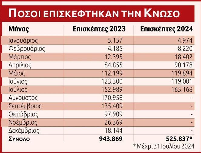 Την ίδια ώρα, αν λάβουμε υπόψη ότι ήδη από τον Ιανουάριο μέχρι και τον Ιούλιο τον αρχαιολογικό χώρο της Κνωσού έχουν επισκεφτεί συνολικά 525.837 άτομα βάσει των εισιτηρίων που έχουν κοπεί, τότε προμηνύεται ότι και αυτή τη χρονιά η επισκεψιμότητα στην Κνωσό μπορεί να σπάσει κάθε ρεκόρ, εκτός απροόπτου και εφόσον δε θα συμβεί κάτι πολύ τραγικό σε παγκόσμιο επίπεδο που να λειτουργήσει ανασταλτικά σε αυτά τα θετικά σενάρια.
