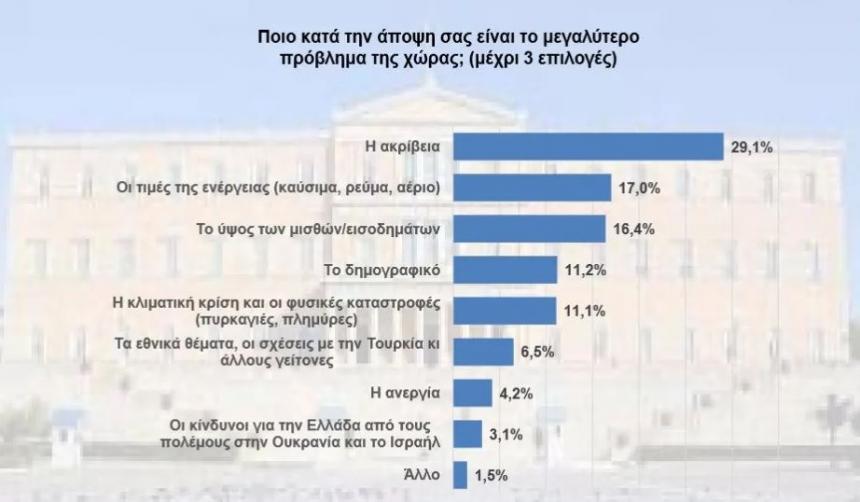 Οι πολίτες αξιολογούν την ακρίβεια ως το μεγαλύτερο πρόβλημα της καθημερινότητας, ενώ ψηλά βρίσκονται η αύξηση των μισθών και το δημογραφικό.