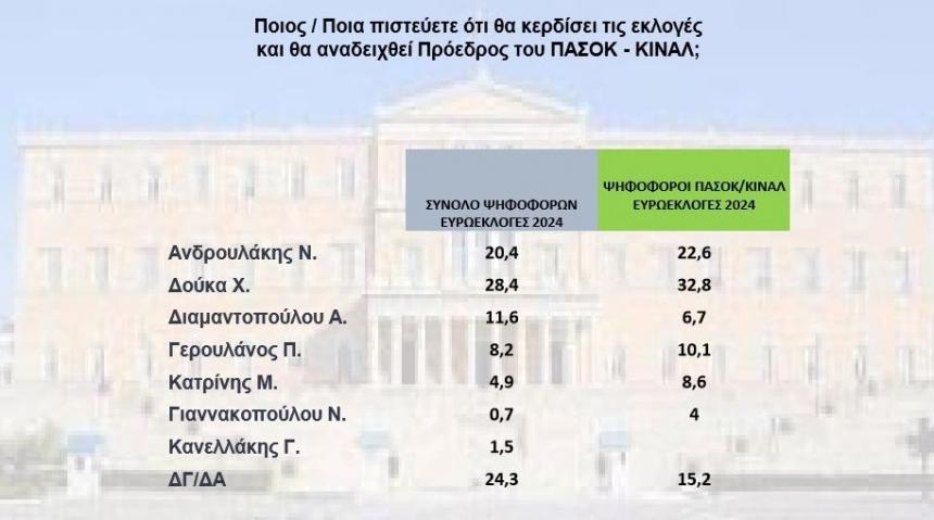 Ως προς τις εσωκομματικές εκλογές στο ΠΑΣΟΚ ο Χάρης Δούκας φαίνεται ότι έχει σημαντικό προβάδισμα τόσο εντός του κόμματος, όσο και ευρύτερα στο εκλογικό σώμα, καθώς προηγείται από 8 έως 10 μονάδες του Νίκου Ανδρουλάκη.