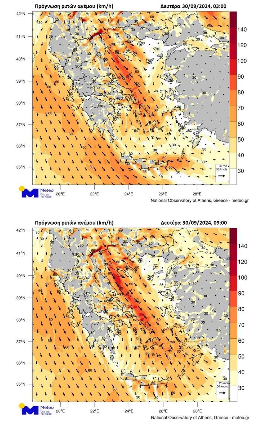 Κατά τη διάρκεια της νύχτας (03:00) και το πρωί της Δευτέρας (09:00), αναμένονται ριπές ανέμου που τοπικά θα ξεπερνούν τα 90 km/h.