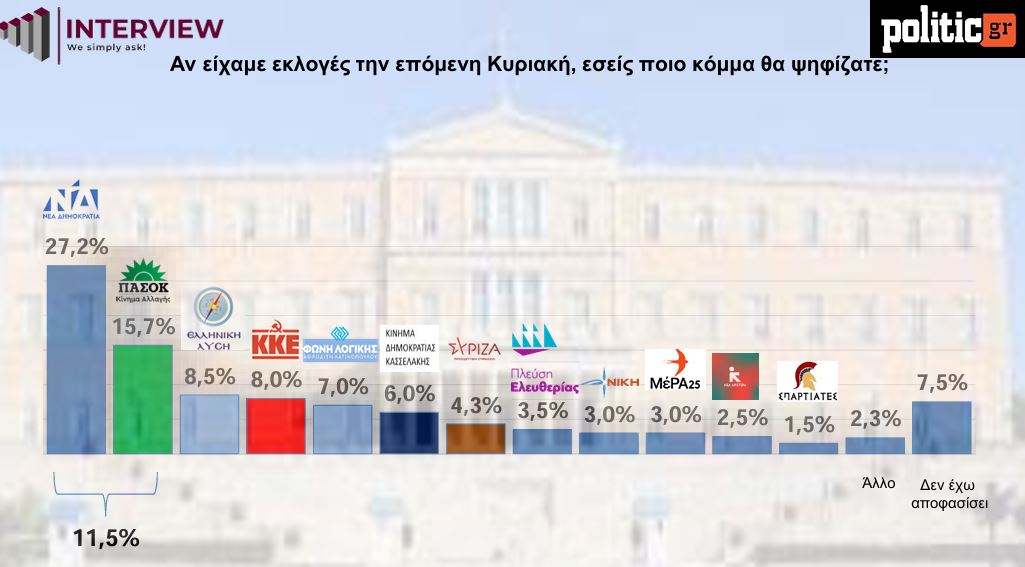 Πρωτιά της Νέας Δημοκρατίας με ευρύ προβάδισμα, ενίσχυση του ΠΑΣΟΚ, «ισοπαλία» της Φωνής της Λογικής με το Κίνημα Δημοκρατίας του Στέφανου Κασσελάκη στο 7% και καθίζηση του ΣΥΡΙΖΑ δείχνει δημοσκόπηση της Interview για την POLITIC.