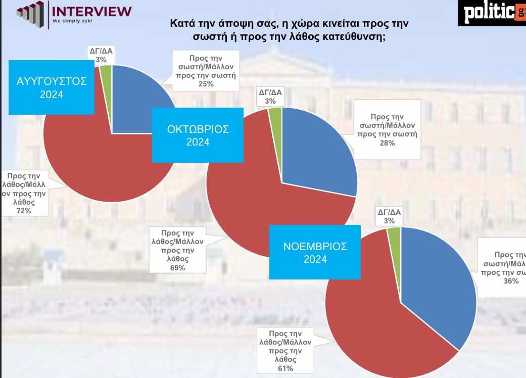 Έξι στους δέκα πολίτες (61%) θεωρούν πως η χώρα κινείται προς τη λάθος κατεύθυνση σε αντίθεση με το 36% που κρίνει πως κινείται προς τη σωστή. Ωστόσο το αντίστοιχο ποσοστό απαισιοδοξίας (72%) παρουσιάζει φθίνουσα πορεία από τον Αύγουστο, και αντίστοιχα αύξουσα τάση το ποσοστό της αισιοδοξίας (από 25% τον Αύγουστο στο 36% τον Νοέμβριο).