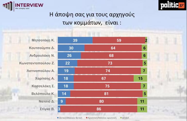 Σε ό,τι αφορά τη δημοτικότητα των πολιτικών αρχηγών, ο Κυριάκος Μητσοτάκης προηγείται σε θετικές γνώμες και μάλιστα τόσο ο πρωθυπουργός όσο και ο Νίκος Ανδρουλάκης παρουσιάζουν αύξηση στα ποσοστά δημοφιλίας, σε σύγκριση με την έρευνα του προηγούμενου μήνα (Κ. Μητσοτάκης 39% από 34,6% και Ν. Ανδρουλάκης 26% από 24,6%).