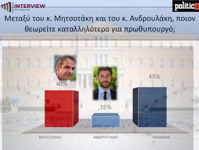 Στην ερώτηση «ποιον θεωρείτε καταλληλότερο για πρωθυπουργό» ο «Κανένας» (45%) είναι πρώτος σε σχέση με τους προέδρους των δύο πρώτων κομμάτων. Ο Κ. Μητσοτάκης συγκεντρώνει 40%, ενώ ο Ν. Ανδρουλάκης τοποθετείται αρκετά χαμηλότερα στο 15%.