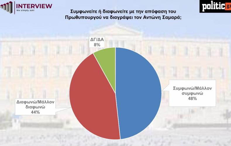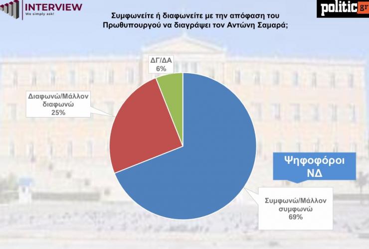 Αν και η διαγραφή Σαμαρά προκάλεσε αναταράξεις στους κόλπους της Ν.Δ., από την έρευνα προκύπτει ότι όχι μόνο δεν έπληξε δημοσκοπικά την κυβέρνηση, αλλά βγαίνει ενισχυμένη. Στους ψηφοφόρους της Ν.Δ., 7 στους 10 συμφωνούν με τη διαγραφή, ενώ το 25% διαφωνεί με την απόφαση αποπομπής.