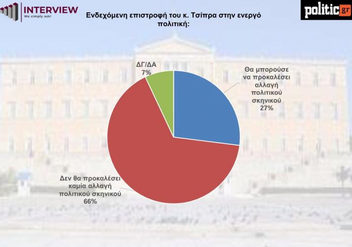 Σε ό,τι αφορά το ενδεχόμενο επανόδου του Αλ. Τσίπρα στην ενεργό πολιτική, το 66% απαντά πως δεν θα προκαλούσε αλλαγή στο πολιτικό σκηνικό, ενώ το 27% δηλώνει πως θα μπορούσε να προκαλέσει κάποια αλλαγή.