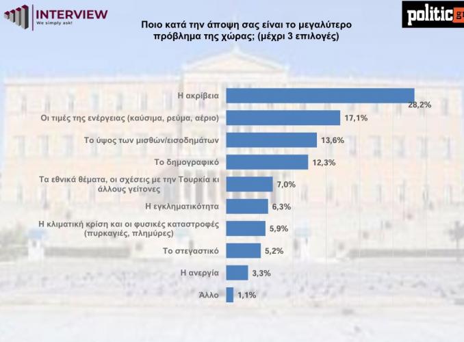 Όπως προκύπτει από την έρευνα, η ακρίβεια, οι υψηλές τιμές της ενέργειας και οι χαμηλοί συνεχίζουν να είναι σταθερά στην πρώτη τριάδα με τα μεγαλύτερα προβλήματα που αντιμετωπίζουν οι πολίτες. Την πεντάδα συμπληρώνουν το δημογραφικό και τα εθνικά θέματα.