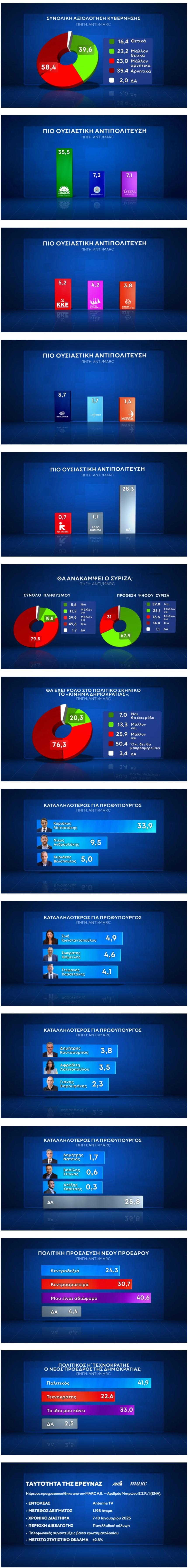 Ένα θετικό μομέντουμ για την κυβέρνηση καταγράφεται στο δεύτερο μέρος της δημοσκόπησης της Marc, που παρουσιάστηκε στο κεντρικό δελτίο του ΑΝΤ1. Οι θετικές γνώμες είναι σχεδόν 40%, ενώ ο Κυριάκος Μητσοτάκης προηγείται με 24,4 μονάδες διαφορά του Νίκου Ανδρουλάκη στην καταλληλότητα για την πρωθυπουργία.