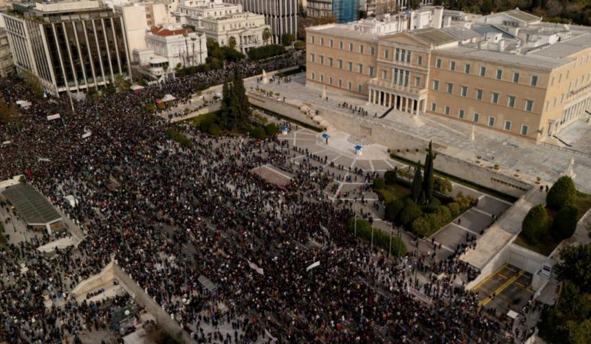 «Χιλιάδες άνθρωποι διαδήλωσαν σε όλη την Ελλάδα για να ζητήσουν δικαιοσύνη για τα 57 θύματα του σιδηροδρομικού δυστυχήματος στα Τέμπη, που σημειώθηκε στις 28 Φεβρουαρίου 2023 κοντά στην πόλη της Λάρισας».