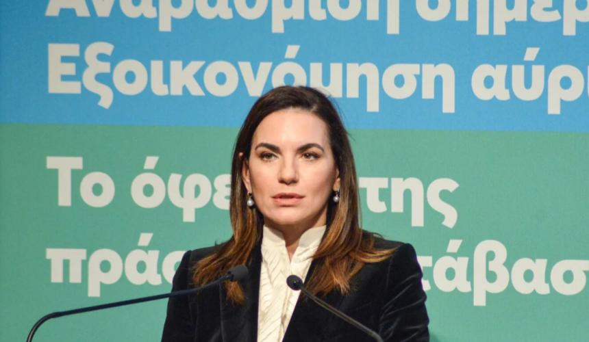 Η υπουργός απηύθυνε χαιρετισμό σε εκδήλωση του υπουργείου Περιβάλλοντος και Ενέργειας. Σημειώνεται ότι στο επίκεντρο της εκδήλωσης βρέθηκε η παρουσίαση επτά νέων προγραμμάτων για την ενεργειακή αναβάθμιση, μεταξύ των οποίων περιλαμβάνεται και η βελτίωση της ενεργειακής απόδοσης των ορεινών τουριστικών καταλυμάτων.