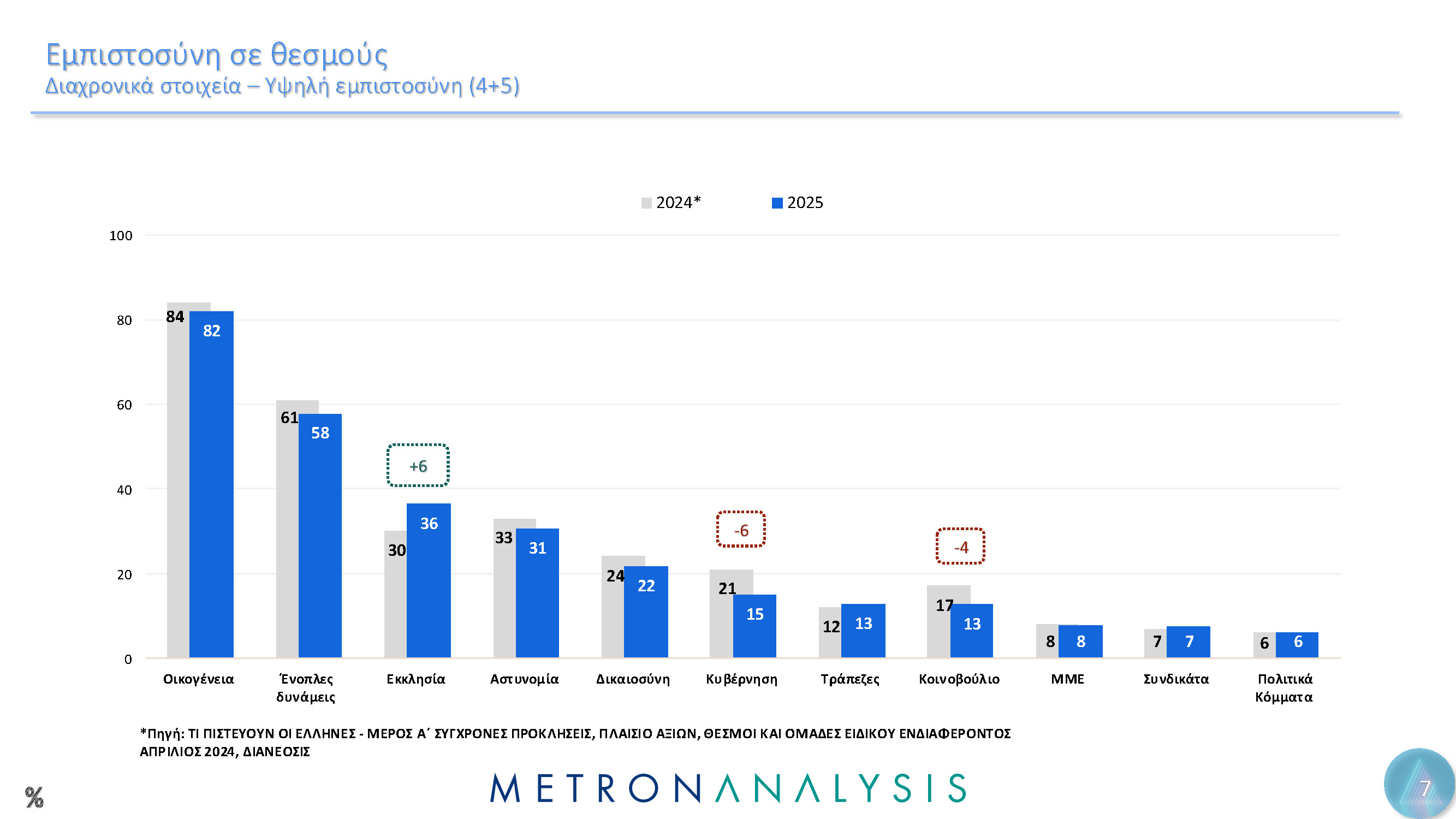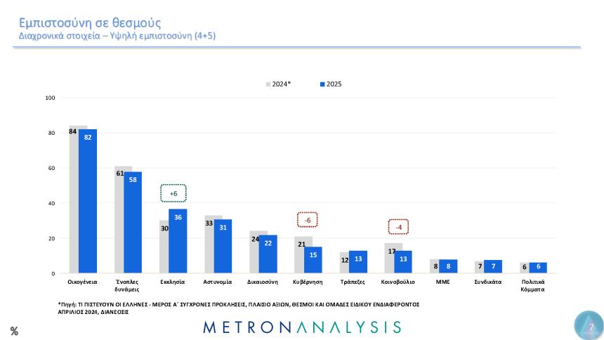 Στην ερώτηση «πόσο εμπιστεύεστε κάθε έναν από τους παρακάτω θεσμούς;», τις περισσότερες θετικές απαντήσεις έλαβε η οικογένεια, καταγράφοντας ισοζύγιο θετικών έναντι αρνητικών γνωμών +77. Ακολουθούν αρκετά πιο κάτω οι Ένοπλες Δυνάμεις με +40. Τρίτος θεσμός είναι τα Πανεπιστήμια, με ισοζύγιο +24.