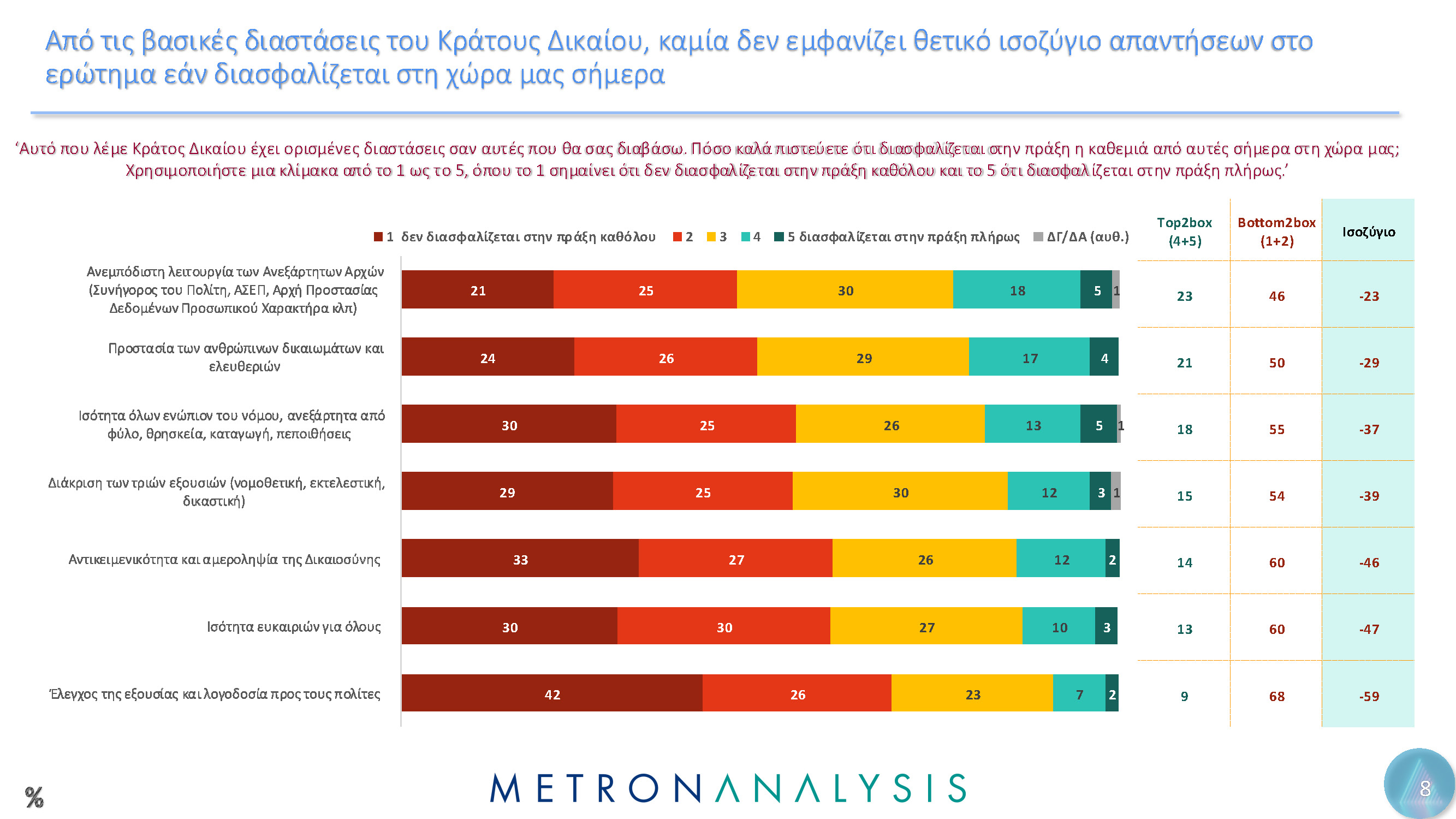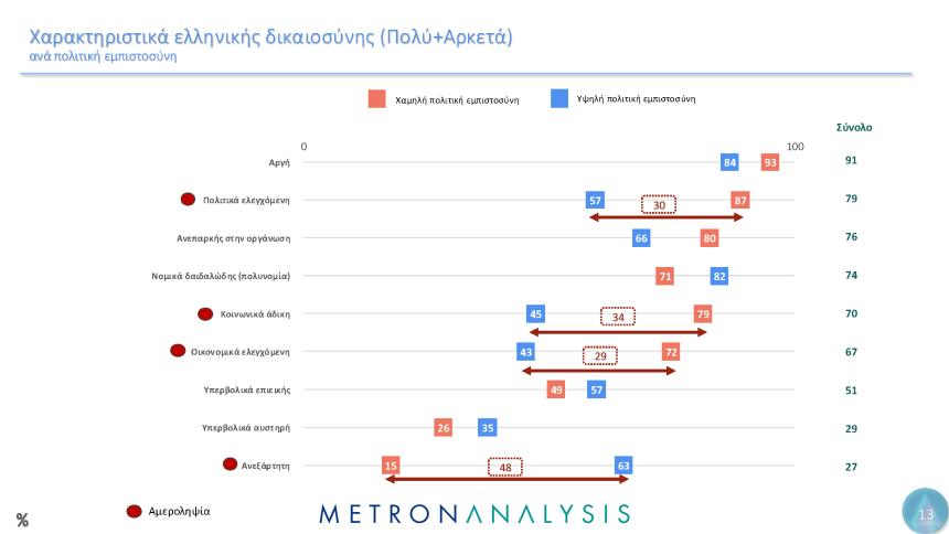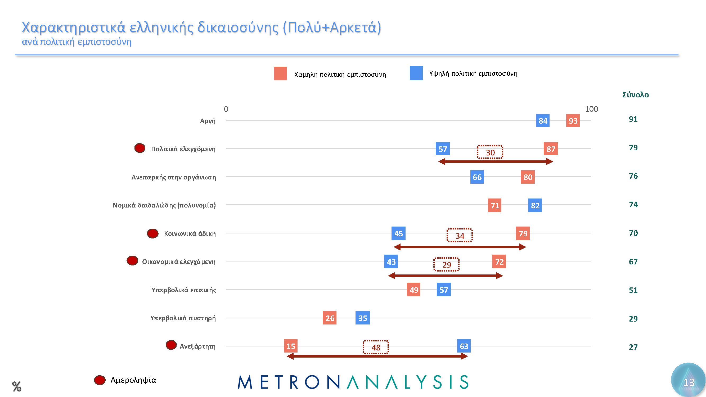 Δικαιοσύνη, υπερεθνικοί θεσμοί (ΕΕ, ΟΗΕ κ.λπ.) και ΕΣΥ καταγράφονται με χαμηλή εμπιστοσύνη, στο φάσμα του -24 έως -31
