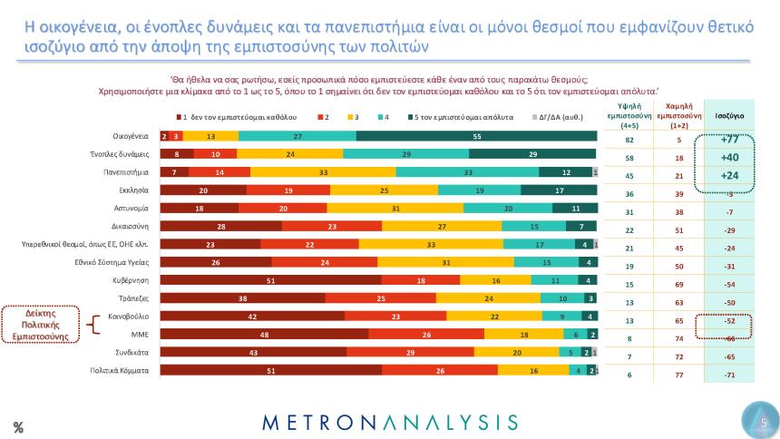 Ακόμα χαμηλότερη είναι η εμπιστοσύνη στην κυβέρνηση, τις τράπεζες και το Κοινοβούλιο (περί το -50).