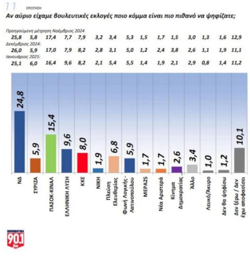 Τα αποτελέσματα της δημοσκόπησης της GPO για τα Παραπολιτικά 90,1 δείχνουν προβάδισμα της ΝΔ, πτώση για ΠΑΣΟΚ, αλλά και ενίσχυση του αντισυστημισμού λόγω της υπόθεσης των Τεμπών.
