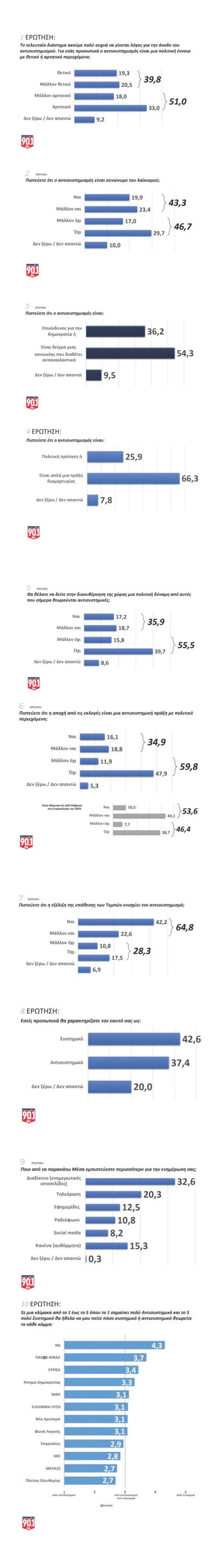 Ωστόσο, στο ερώτημα αν οι πολίτες θα ήθελαν στη διακυβέρνηση της χώρας μία πολιτική δύναμη από αυτές που θεωρούνται αντισυστημικές το 55,5% λέει «όχι», (39,7%), «μάλλον όχι» .