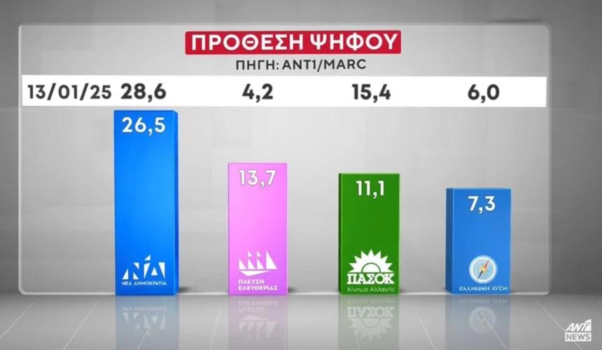 Την εδραίωση της Πλεύσης Ελευθερίας ως δευτέρου κόμματος δείχνει η τελευταία δημοσκόπηση της MARC, αφού η ΝΔ στην πρόθεση ψήφου είναι στο 26,5%, η Πλεύση Ελευθερίας στο 13,7%, και ακολουθούν το ΠΑΣΟΚ 11,1%, η Ελληνική Λύση με 7,3%, ο ΣΥΡΙΖΑ με 6,4%, το ΚΚΕ 6,3%, ενώ όλα τα υπόλοιπα κόμματα είναι κάτω του 3%.