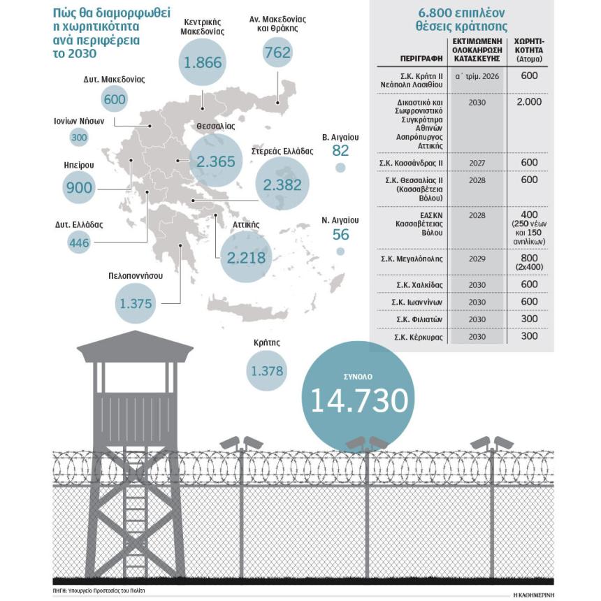 Την αλλαγή του σωφρονιστικού χάρτη της χώρας με την κατασκευή οκτώ νέων φυλακών και την οριστική κατάργηση τουλάχιστον πέντε καταστημάτων κράτησης προβλέπει το σχέδιο δράσης της Γενικής Γραμματείας Αντεγκληματικής Πολιτικής του υπουργείου Προστασίας του Πολίτη για την περίοδο 2025-2030.