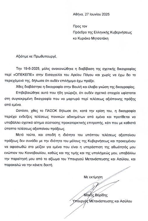 Ανακοινώνεται ότι ο Υπουργός Μετανάστευσης και Ασύλου Μάκης Βορίδης υπέβαλε την παραίτησή του στον Πρωθυπουργό, για τους λόγους που αναφέρονται στην επιστολή και η οποία επισυνάπτεται. Ο Πρωθυπουργός έκανε δεκτή την παραίτησή του.