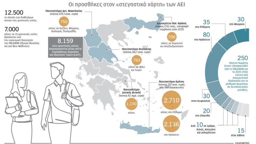 Πιο συγκεκριμένα, για πρώτη φορά το Ιδρυμα Νεολαίας και Διά Βίου Μάθησης (ΙΝΕΔΙΒΙΜ) σε συνεργασία με τα ΑΕΙ προχώρησε σε καταγραφή των αναγκών σε πόλεις με αυξημένη ζήτηση στέγης και για το ακαδημαϊκό έτος 2025-2026 έχει ήδη ξεκινήσει διαγωνιστική διαδικασία για τη μίσθωση δωματίων σε ξενοδοχεία, με στόχο την κάλυψή τους.