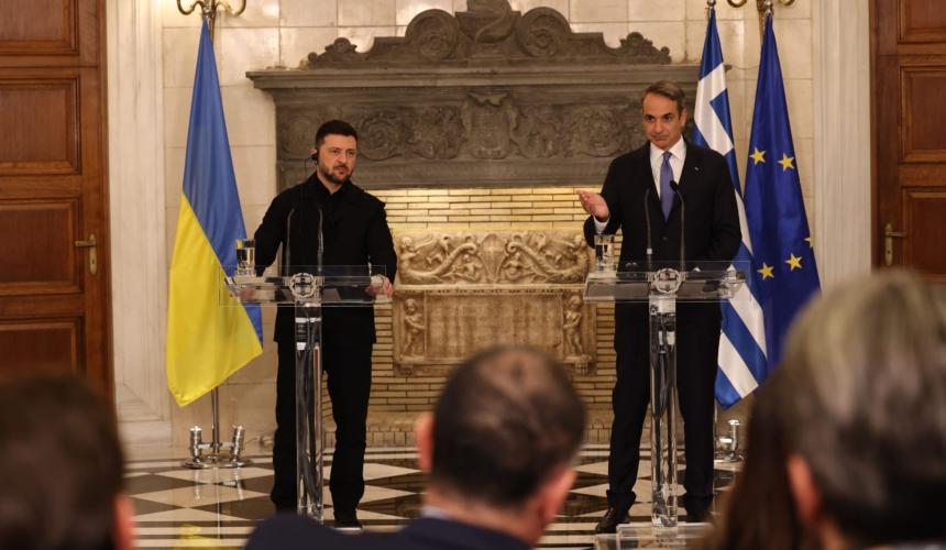 Ο πρωθυπουργός Κυριάκος Μητσοτάκης, στις κοινές δηλώσεις του με τον κ. Ζελένσκι επανέλαβε ότι «στην Αθήνα η Ουκρανία έχει έναν σταθερό σύμμαχο», υπογραμμίζοντας πως η Ελλάδα θα συνεχίσει, «στο μέτρο των δυνατοτήτων της», να στηρίζει τη «γενναία αντίσταση του ουκρανικού λαού απέναντι στη ρωσική εισβολή».
